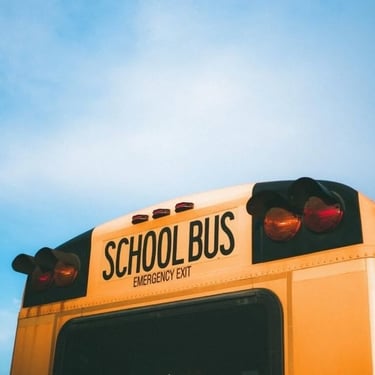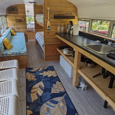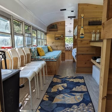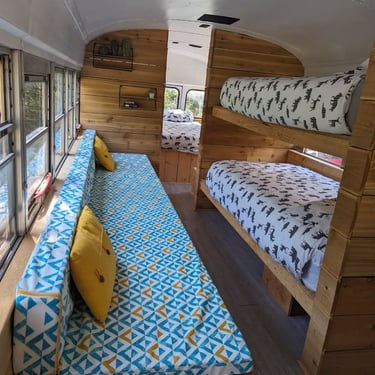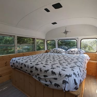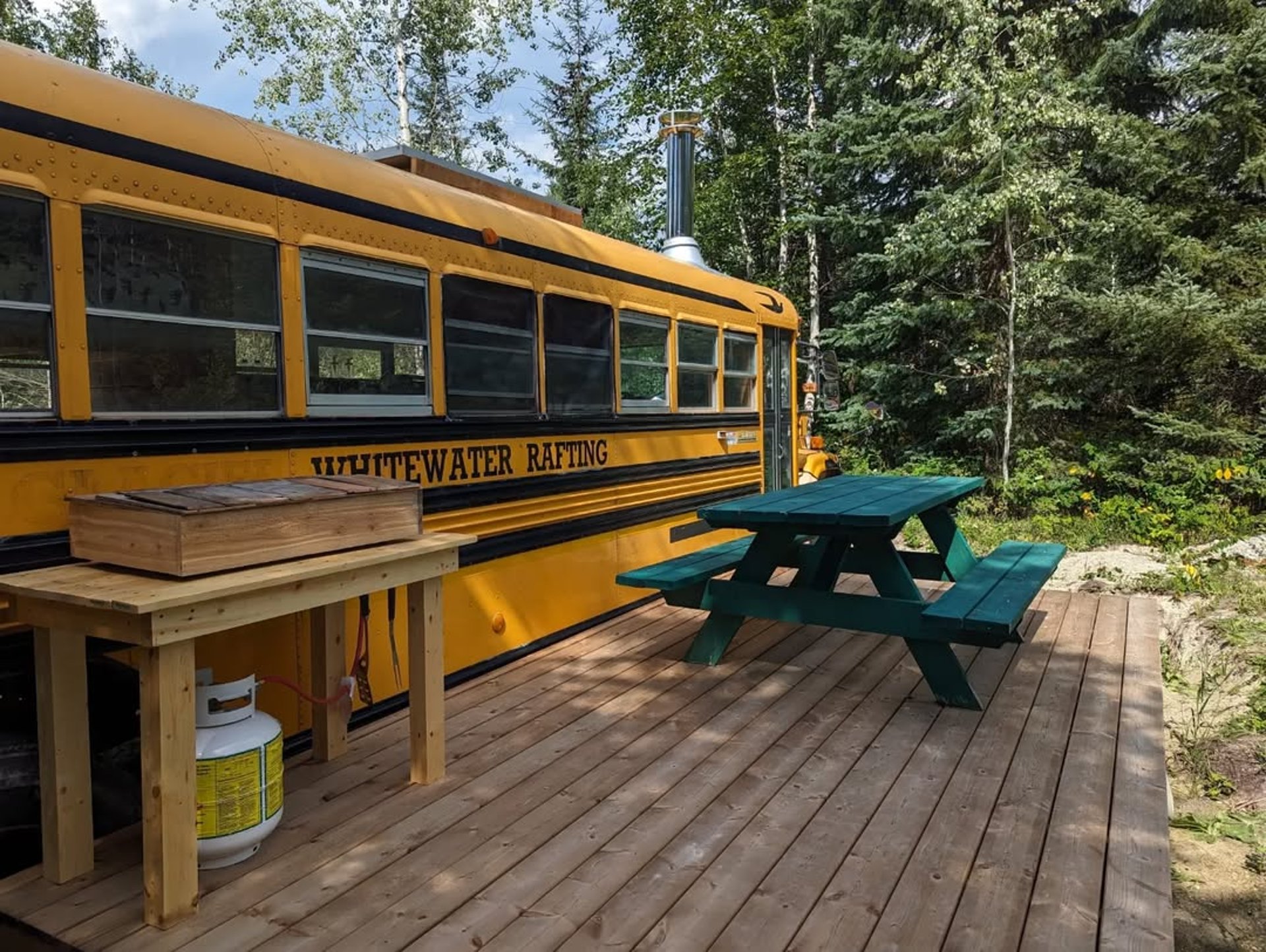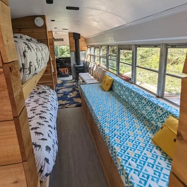 The Sleepy Bear Skoolie — a real converted school bus, set deep in old-growth forest, woken by morning light and the sound of the nearby river.