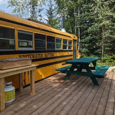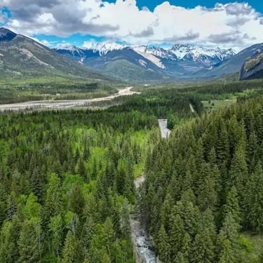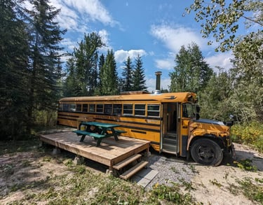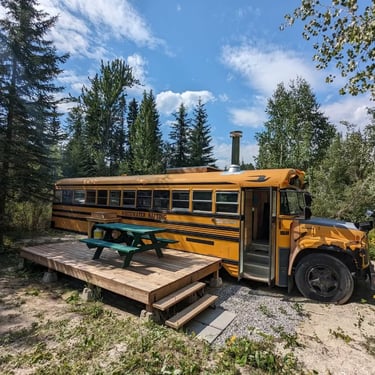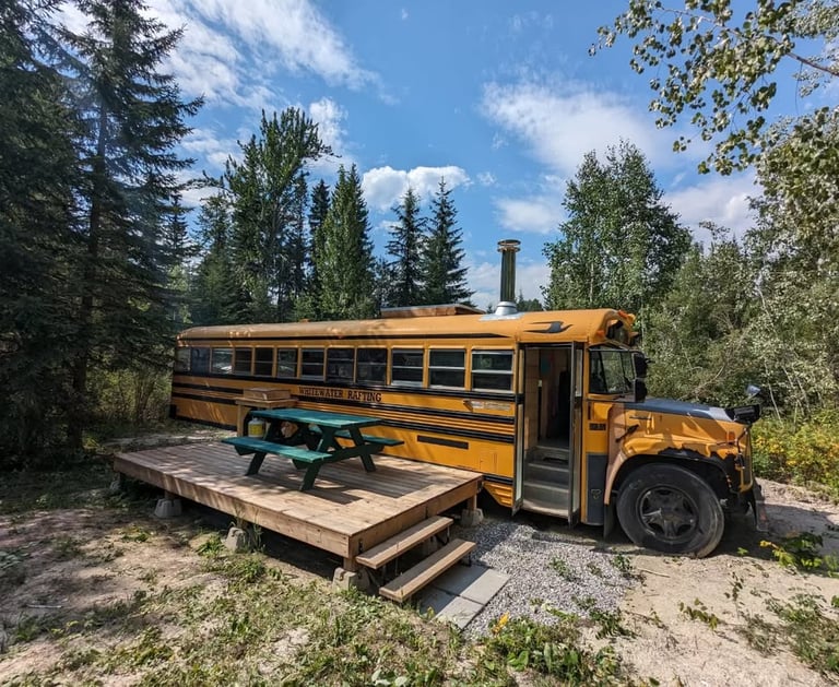 🏔️ 150 acres of private wilderness in the Blaeberry Valley, 20 min from Golden. Iconic renovated yellow school bus nestled in the forest with mountain views — a unique and unforgettable experience for the whole family. Three private waterfalls accessible via a private trail. Thomson Falls and several well-known trails less than 3 km away. Direct vehicle access. Authentic wildlife and the Canadian Rockies as your playground.
