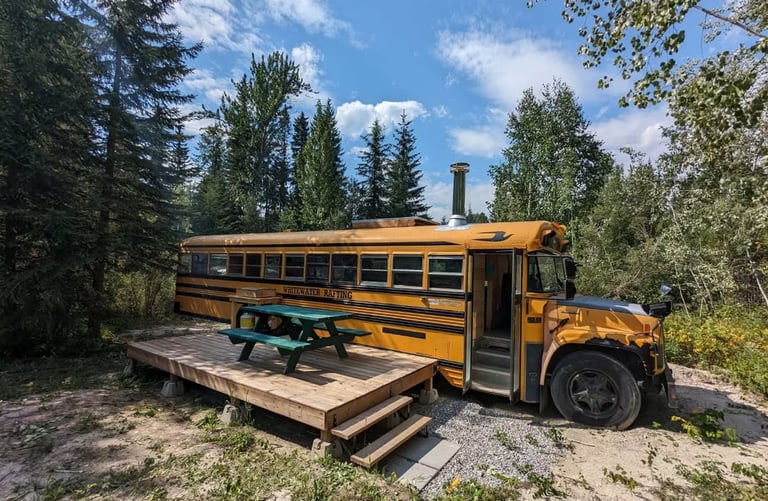 🏔️ 150 acres of private wilderness in the Blaeberry Valley, 20 min from Golden. Iconic renovated yellow school bus nestled in the forest with mountain views — a unique and unforgettable experience for the whole family. Three private waterfalls accessible via a private trail. Thomson Falls and several well-known trails less than 3 km away. Direct vehicle access. Authentic wildlife and the Canadian Rockies as your playground.
